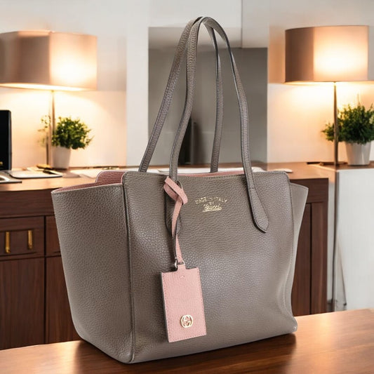 Gucci Swing Tote Bag Shoulder Leather Charcoal Brown Pink