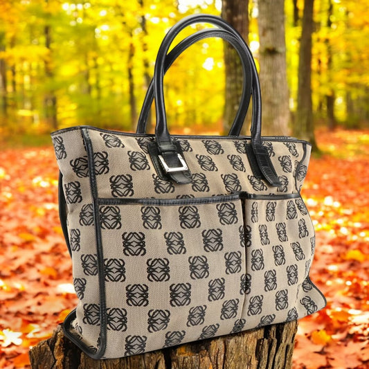 Loewe Anagram Tote in Beige and Black Canvas with Leather Trim