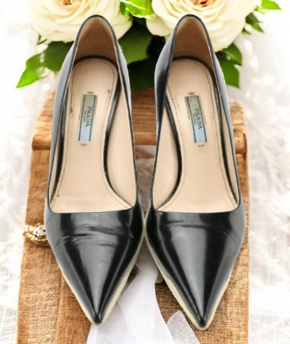 Prada Black Leather Pointed Toe Pumps with White Rubber Sole Accent
