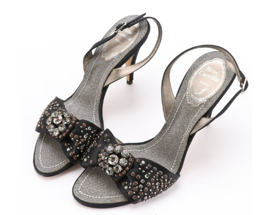 René Caovilla Embellished Black Satin and Metallic Dress Sandals
