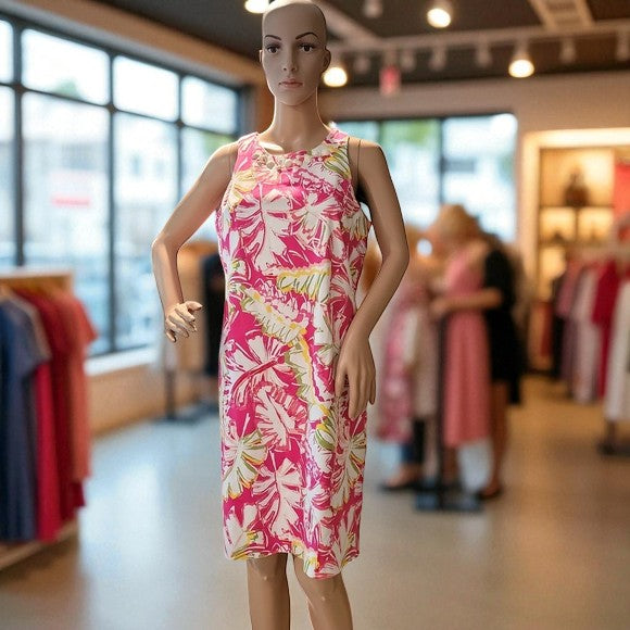 Pappagallo Women's Dress Pink Yellow Jeweled Neckline Hawaiian Tropical